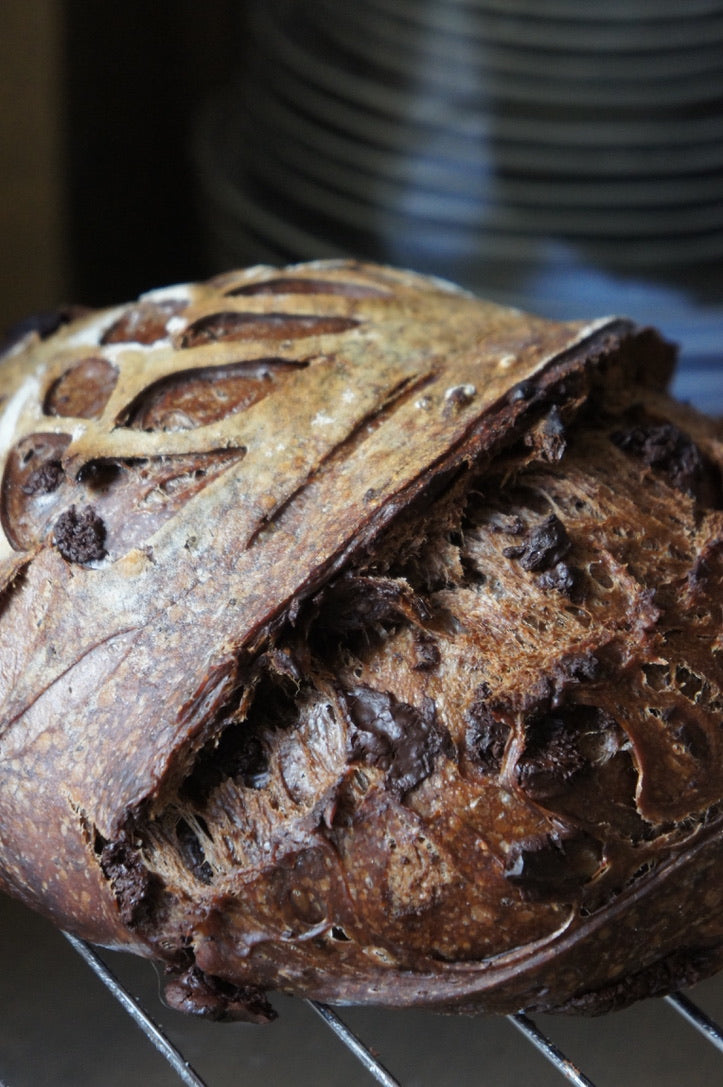 Country Loaf 800g made with Sourdough Starter; Water; Strong Flour; Salt; Black Cocoa Powder; Cane Sugar; Vanilla Extract; Dark Chocolate Chips.